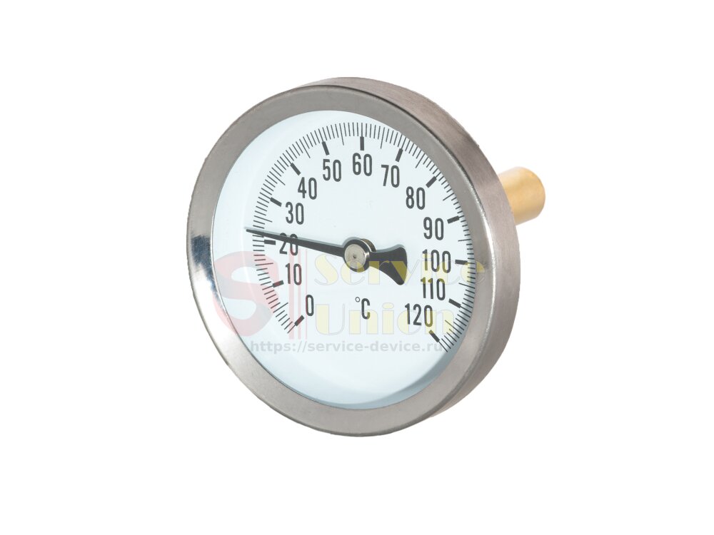Биметаллический аксиальный термометр T63 120 °С для систем отопления. Стальной никелированный корпус с латунным штоком под погружную гильзу глубиной 50 мм. Белый циферблат с чёрной шкалой под акриловым стеклом. |